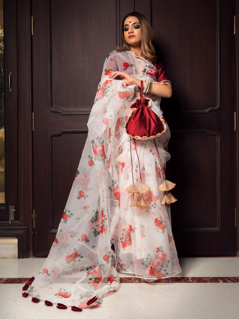 Try this classy floral saree for a sophisticated cocktail party or reception look. The striking brown and red designs on the white silhouette saree increase the glam factor while still keeping it understated. Wear a full-sleeved printed shirt underneath to make it a matching outfit.